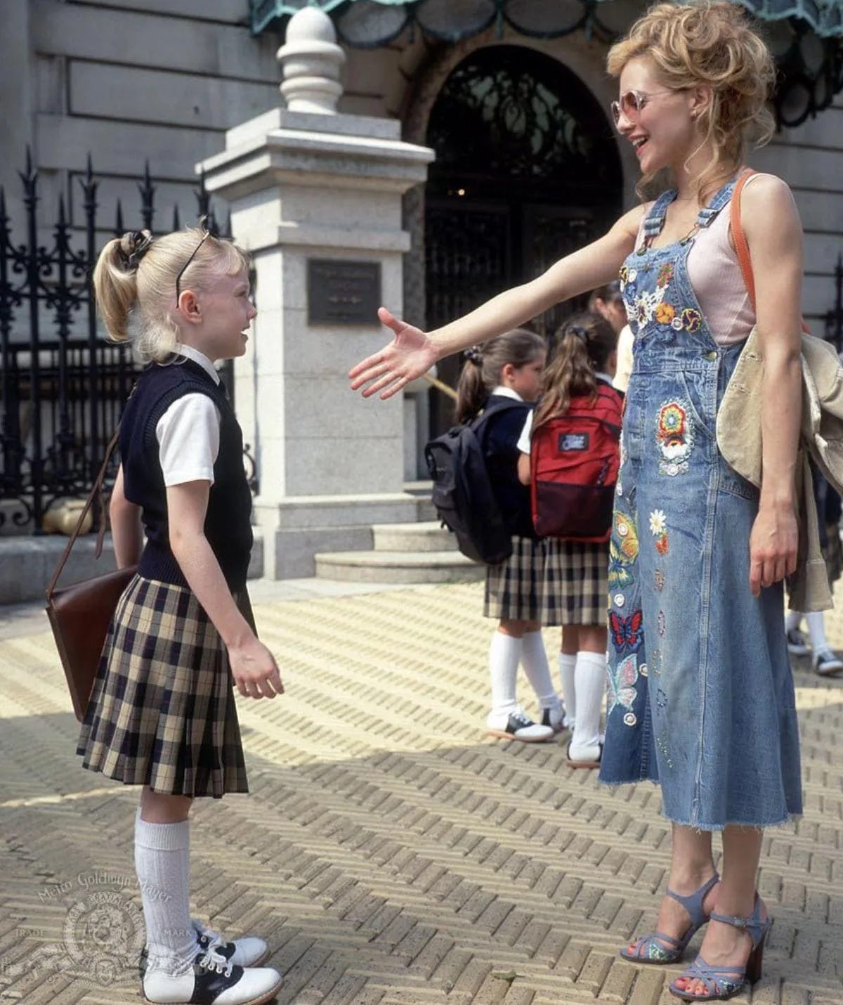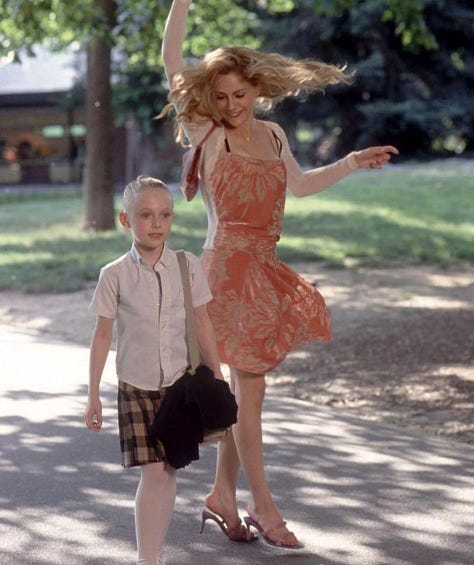 Opposite her, Dakota Fanning’s Ray is dressed in the complete inverse. Gray pleats, muted neutrals, structure over softness. Her miniature adult wardrobe makes her look like a banker trapped in an eight year old’s body. The two of them side by side become a perfect costume study in arrested development and premature maturity. Ray’s clothes are about control; Molly’s are about evasion.